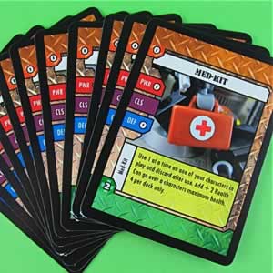 BATTLE LINES is available in a 36 card starter deck which includes 13 Character cards, 11 Equipment cards & 13 Weapon cards. Also included in each starter deck are Rules, 1D6(Six sided Dice), 20 Ammo Studs (Transparent Orange), 20 Health Studs (Transparent Green) and