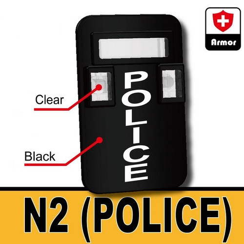 Loading... Please wait...Lego minifig compatible Custom SI-Dan Toys N2 POLICE Riot Shield, fits into the hand of a minifigure via the hand grip at the back of the shield which also has a clear view screen. The shield has "POLICE" printed vertically on to it.