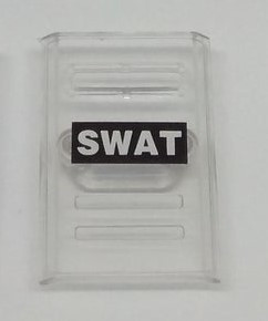 Lego minifig compatible Custom SI-Dan Toys N4 SWAT Riot Shield, fits into the hand of a minifigure via the removable hand grip at the back of the shield.
